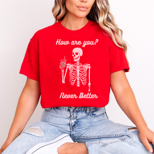 Never Better Skeleton Drinking Coffee T-shirt