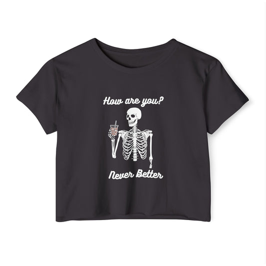 Never Better Skeleton Drinking Coffee Crop Top